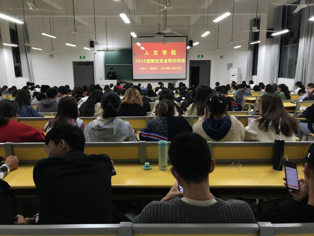10月16日晚7点,人文学院于明理楼301教室举办2019级新生安全知识讲座,邀请学校保卫处副处长孙东升主讲。讲座由学院党委副书记姚嗣宏主持,辅导员闪诚章以及全体2019级新生参与本次活动。