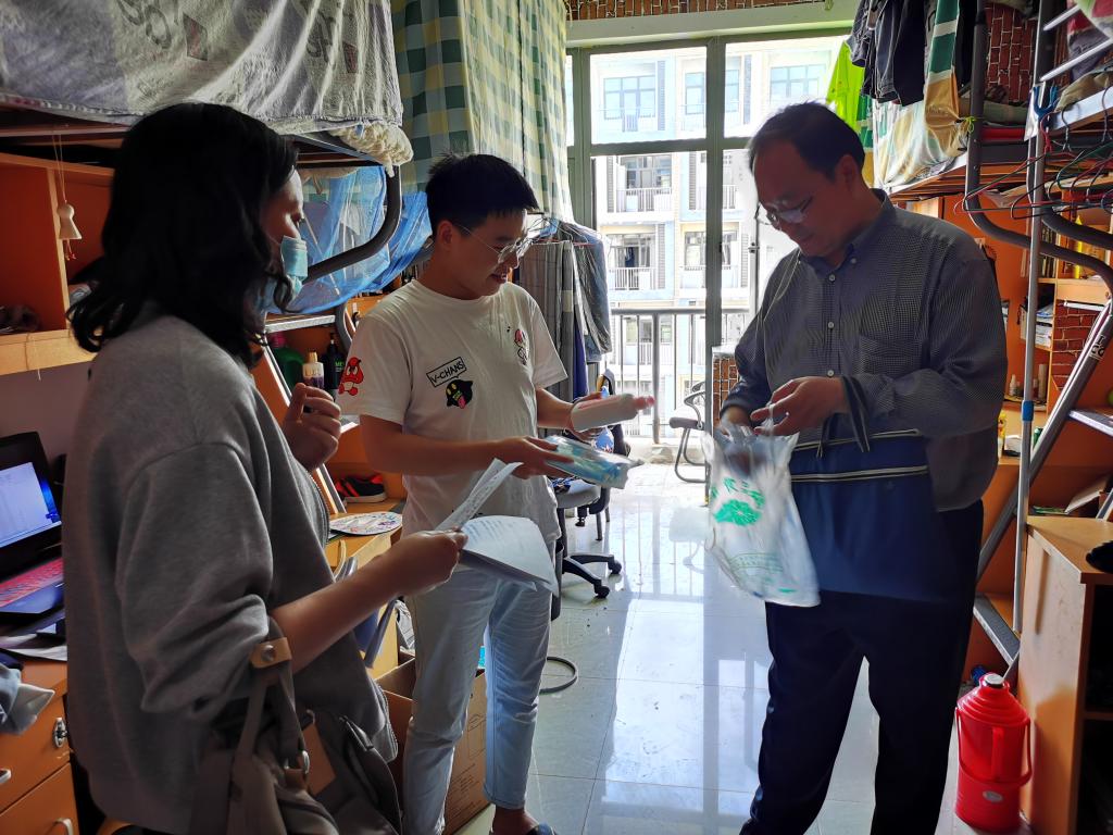 5月19日傍晚,人文学院党总支书记吴云平带领学院班子人员、辅导员深入学生寝室,看望返校的本科毕业班学生,给每个返校学生送上“防疫防护爱心包”,包里有口罩、洗手液、消毒液和体温计等防护物品。