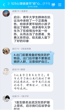 活动开展以来,人文学院心理辅导站(心联部)举办了“疫”心说活动。该活动以QQ群为交流渠道,每日发布讨论问题,引导同学们思考探索解决有关抗疫和心理健康方面的问题。活动期间,同学们踊跃发表见解,“我们会及时了解疫情情况,听从学校安排,好好学习,调整心态”“我们要保持自信、相信国家政府、相信前线的医护,不信谣、不传谣”……