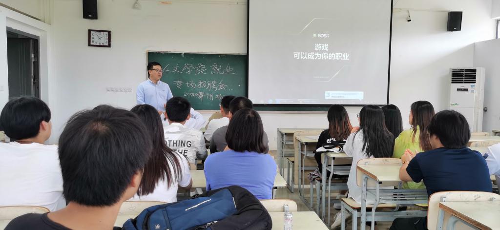 9月23日下午,人文学院在崇智楼333举行专场招聘会,邀请博思中国企业总监黄亮亮为毕业班动画专业进行招聘会宣讲和就业指导。2017级动画专业全体毕业生、毕业班辅导员、学院党总支副书记参加了会议。