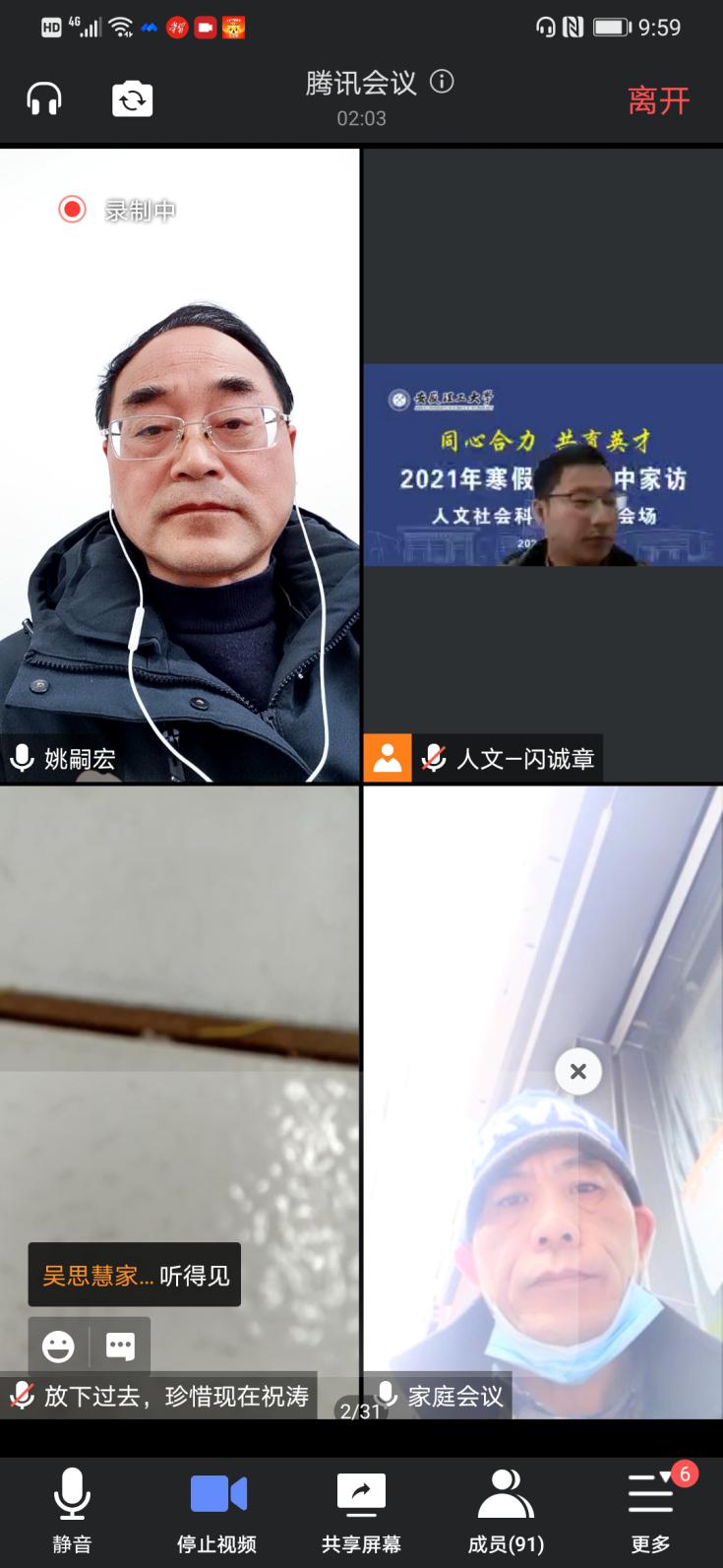 2021年1月20日上午,人文学院利用腾讯会议平台举办线上集中家访交流会,会议由姚嗣宏主持。出席会议的有学院党委书记吴云平,党委副书记、行政副院长姚嗣宏,学院团委书记,专职辅导员以及100余位家长代表。