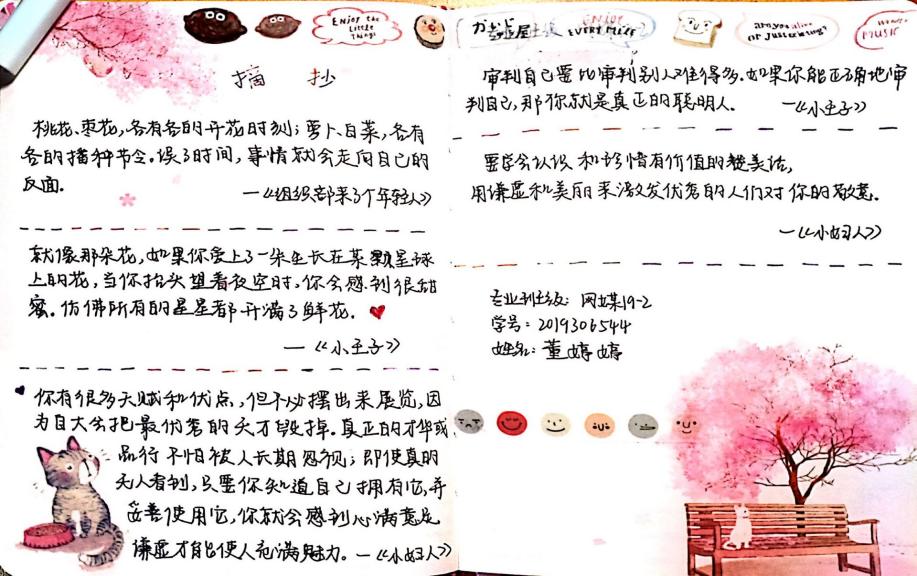 与“读书漂流”同期举办的“书话人生”经典语录摘记活动也在如火如荼地进行。活动鼓励学生用钢笔、毛笔等手写方式,摘记下阅读经典书籍中触动自身的段落语句。在综合考量摘记内容文学价值、笔迹美观程度后,共评选出五位获奖学生:网媒19-2班董婷婷获得一等奖,社工20-1班刘梦吉、网媒20-3班徐意获得二等奖,政行20-1班储诚沛、社工20-1班王嘉玲获得三等奖。