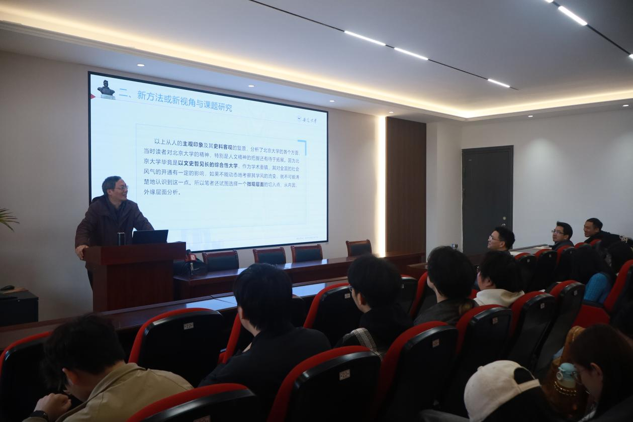 报告中,王天根教授以社会发展与中西文化交流为语境,围绕重大事件的指代性与边界展开跨学科探讨。通过辨析事件文学史、媒介史的内涵与交叉维度,阐释作为方法的媒介史学研究路径;区分非虚构写作与新闻报道,反思新闻真相追求的本质与限度。通过系统梳理文学与历史、政治的关系,考察近现代文学期刊在社会改良与革命思潮中的作用。报告深入剖析了中国媒介史学的反殖民主义建构与本土化发展进程,为师生提供了中西比较视野和跨学科研究经验,也为学院新闻传播学学科建设、学术创新及复合型新闻人才培养提供了新的思路与动力。