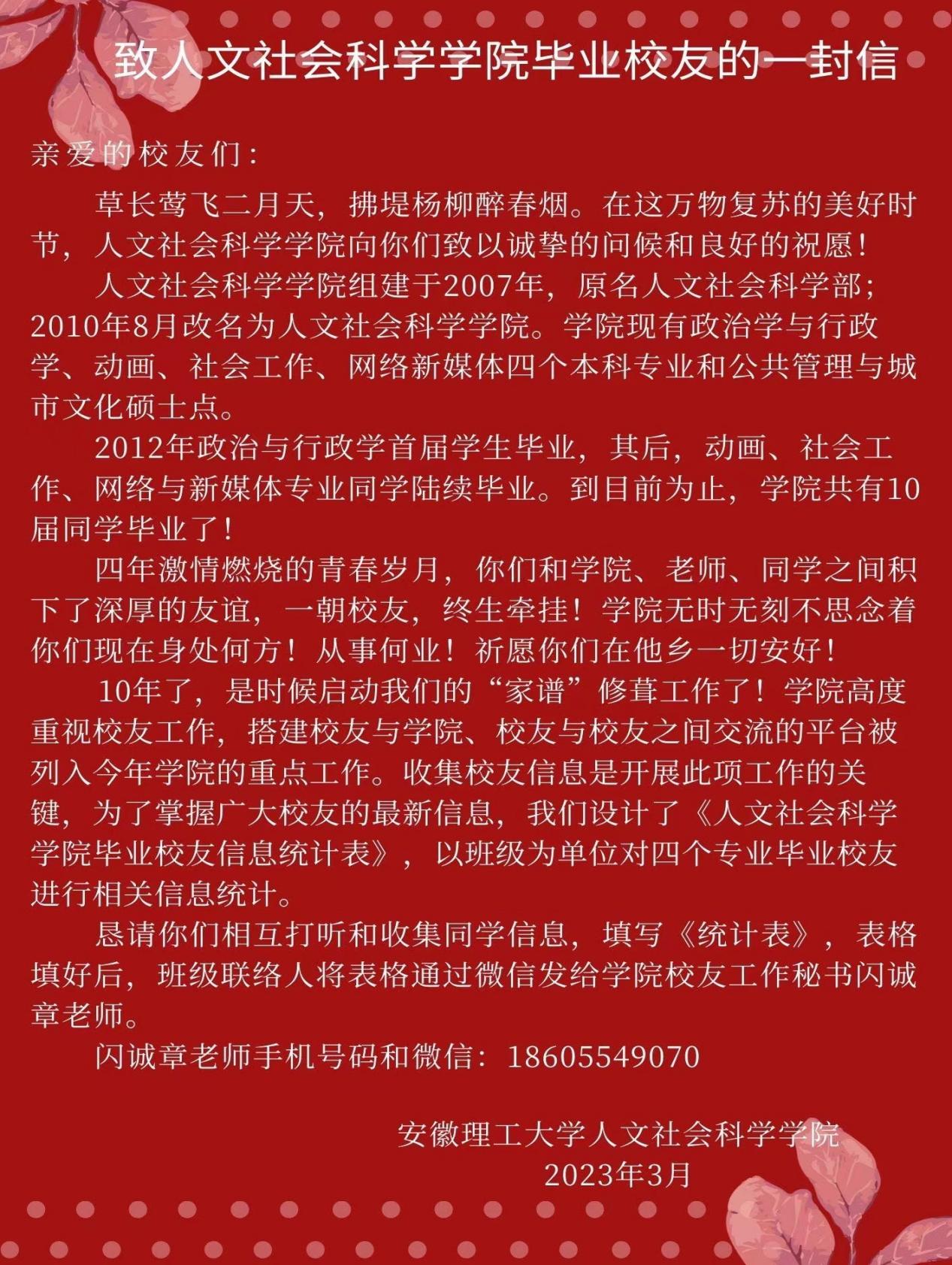 校友是学校事业发展的重要财富,也是学院最生动、最亮丽的名片,人文学院以加强校友联络为契机,通过撰写信件、统计表格等多种形式,与校友保持沟通交流,多措并举扎实推进校友工作。