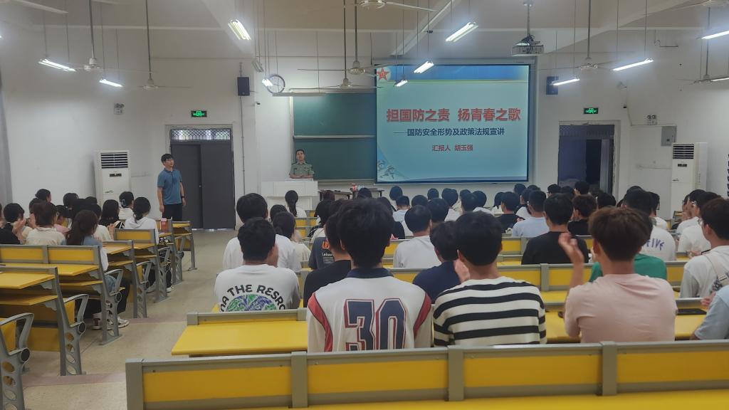 9月15日下午,人文学院邀请寿县县委常委、武装部政委胡玉强为全体新生开展国防教育。胡玉强简单的介绍了当前世界面临的形势,在新时代大学生必须要有所为、有所不为。接下来,他详细讲解了大学生征兵入伍政策、优抚待遇,鼓励在校大学生勇敢携笔从戎,保家卫国,把小我融入大我,展现新时代大学生的担当与作为。