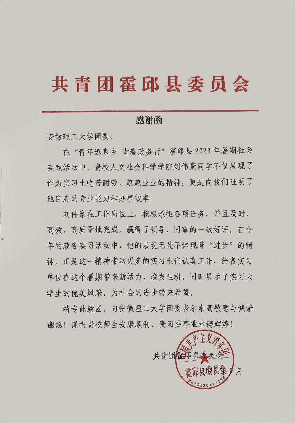 近日,百合小说 收到共青团霍邱县委员会发来的感谢函,表扬百合小说 网络与新媒体专业刘伟豪同学在“青年返家乡,青春政务行”霍邱县2023年暑期社会实践活动中展现了吃苦耐劳、兢兢业业的精神。