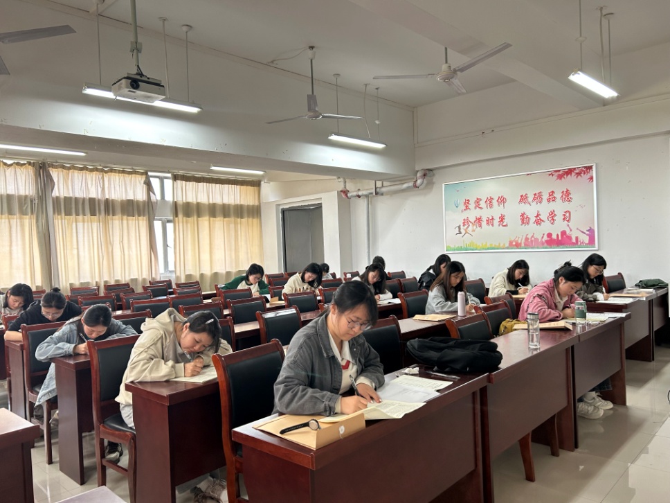 开考前,苟延峰强调了模拟考试的目的和考试规则。他要求同学严格按照研招考试规则作答,在规定的时间内合理安排各类题型的作答时间,规划好答卷布局。监考教师也严格按照考试要求分发试卷、答题纸、草稿纸,认真开展监考工作。整个考场秩序井然,同学们一丝不苟、严谨作答。考试历时三小时,所有同学均完成了试卷作答。
