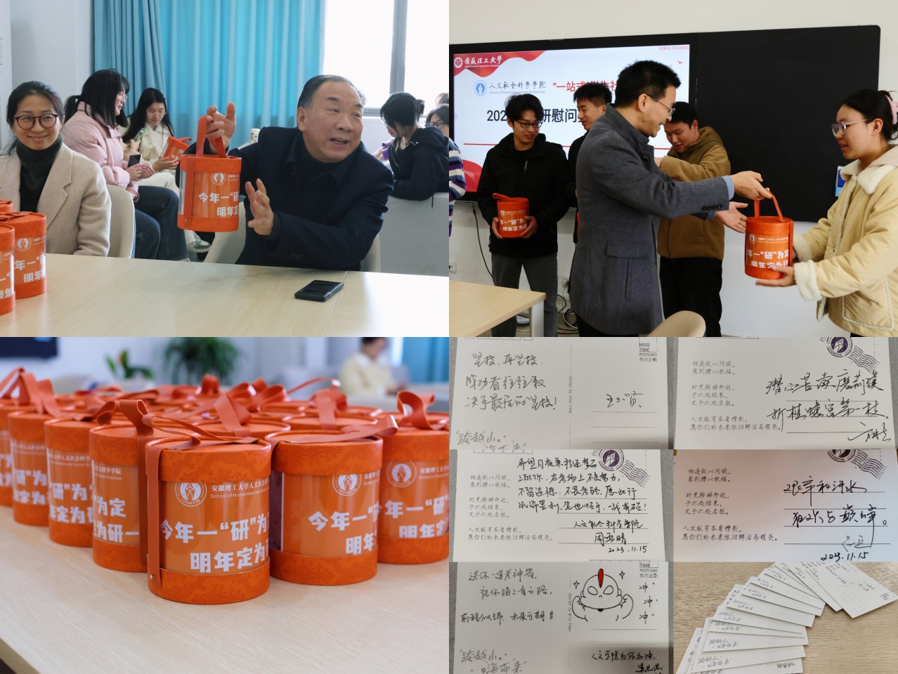 活动最后,学院领导和老师为考研学子送上精心设计和特别定制的“考研加油包”,里面不仅有学习用品,还有学院领导、老师和其他年级学生亲笔书写的祝福卡片,满载着全院师生对考研学子最真挚的祝福。同学们收到暖心礼物后十分感动,纷纷表示将把握好最后的冲刺阶段,全力以赴,以饱满的精神状态迎接考试。