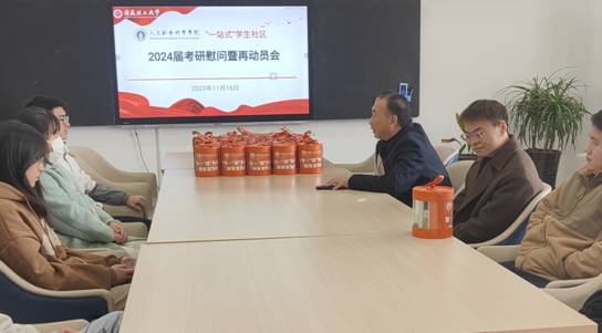 王大贤代表学院表达了对考研学生的关心和祝福,指出成功者往往取决于最后的坚持,勉励同学们一定要坚持到底,坚定考研的决心、信心和恒心,拼搏过后定能收获上岸的喜悦;方胜叮嘱同学们在最后冲刺阶段要合理安排好复习时间,注意劳逸结合,提高学习效率;周雪晴鼓励同学们自信备考,有问题及时沟通,从容应对考试。