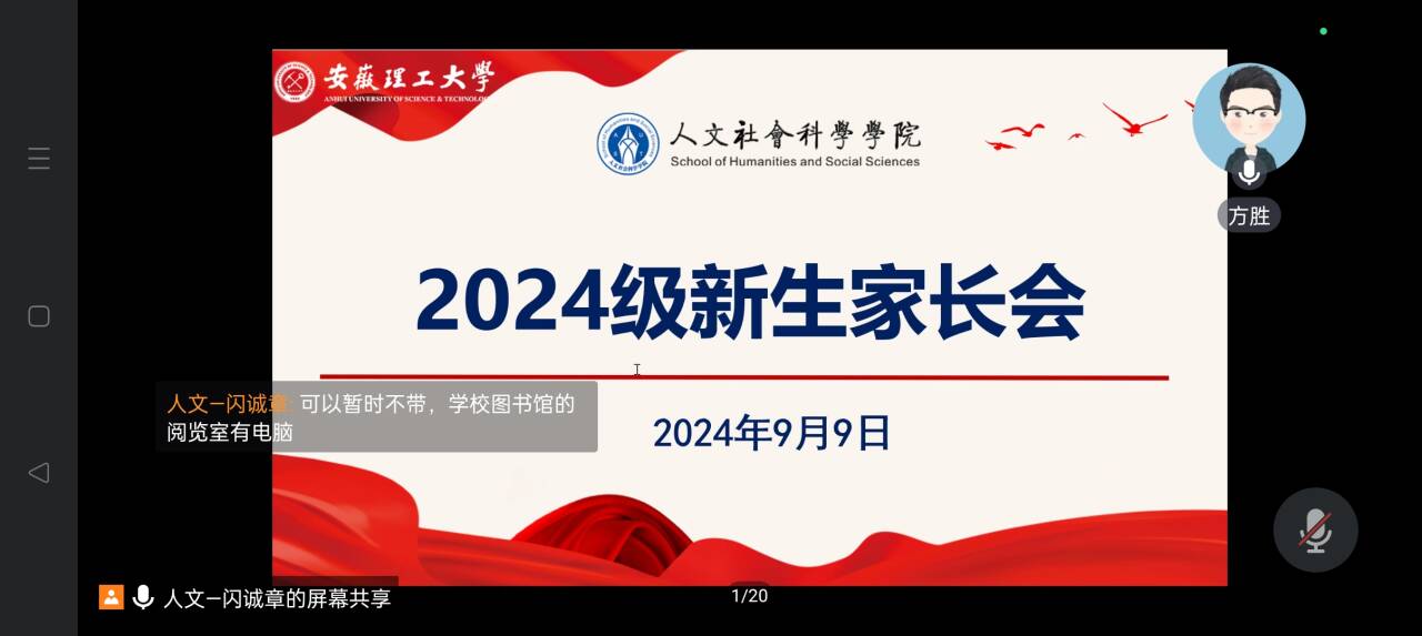 为促进家校联系,加强学院与新生家庭之间的沟通,使新生尽快适应大学生活,9月9日晚,人文学院采取线上形式召2024级新生线上家长会。学院党政领导班子、新生辅导员以及160余位新生家长参会。家长会由学院党委副书记周雪晴主持。