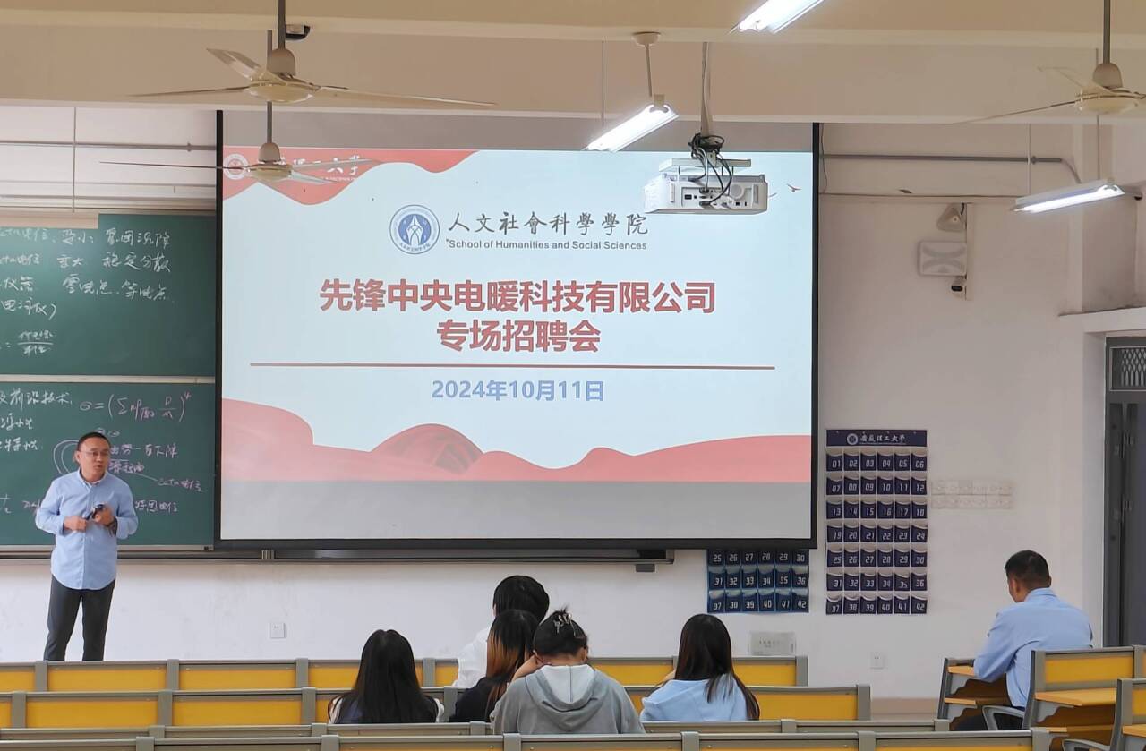 10月11日上午,人文学院邀请先锋中央电暖科技有限公司来学院举行2024年校园就业专场招聘会。学院党委主要负责人、毕业班辅导员以及2025届网媒专业毕业生参加了此次招聘会。