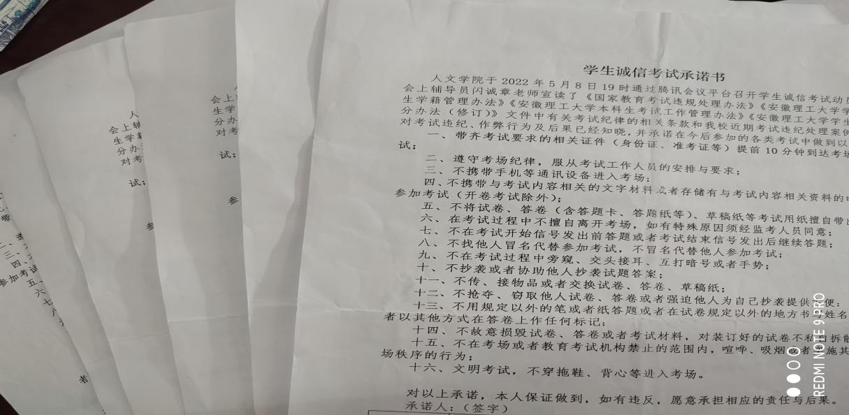 开展考试诚信签名。辅导员老师向学生强调考试的重要性,解释绩点的计算方法及挂科的影响,提醒同学们务必认真复习,积极备考。带领学生回顾《学生手册》对考场纪律的要求,包括规定时间参考、固定位置答题、交卷注意事项等问题,帮助学生调整心态,用真才实学和平稳心境正视考试。着重强调5种考试违纪和8类考试作弊的认定方法,并引导学生在人文学院诚信考试承诺书上签名。