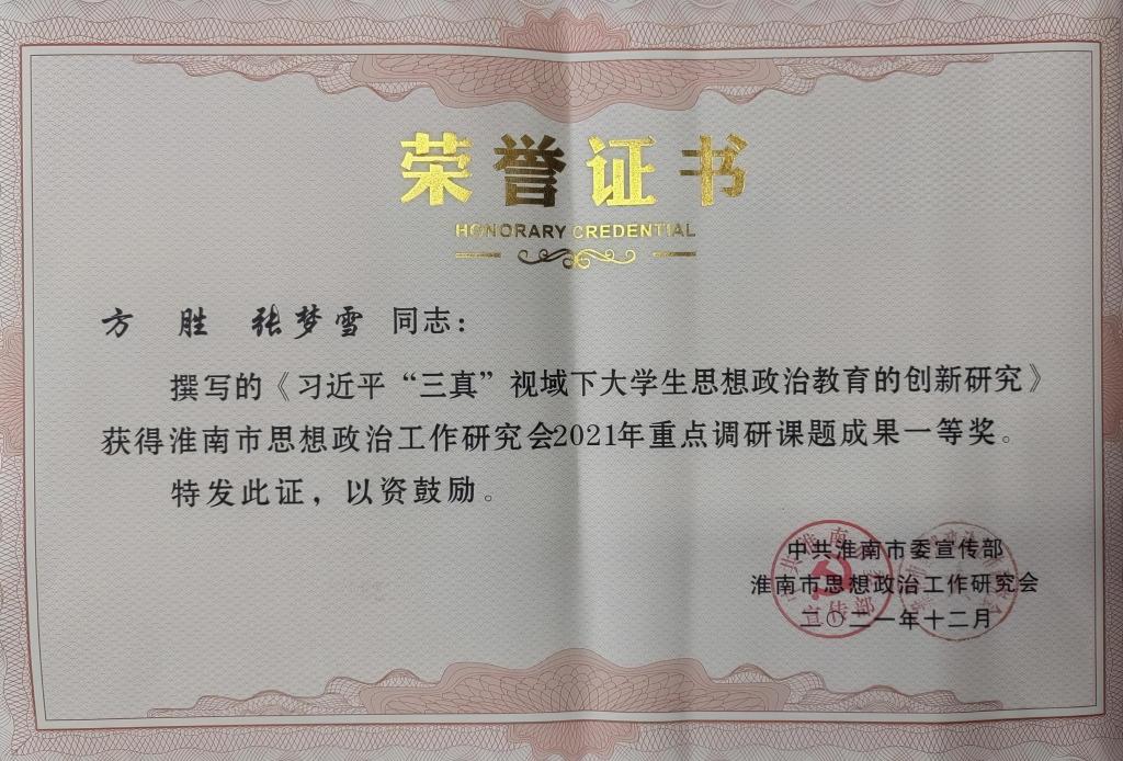 近日,淮南市委宣传部、淮南市思想政治工作研究会公布2021年重点调研课题成果奖励名单,百合小说 百合小说 方胜教授带领政治学与行政学专业2020级本科生张梦雪完成的《习近平“三真”视域下大学生思想政治教育的创新研究》获得一等奖。