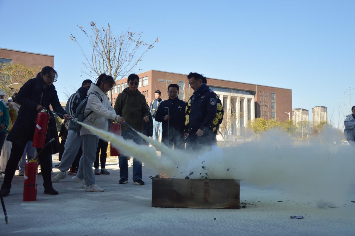最后是灭火器材使用实践,学院联合校保卫处相关人员在学院楼下的空地开展灭火器材使用的现场实践。学院师生按照彭广峰老师所介绍的灭火器使用方法,现场实操灭火,顺利扑灭了提前准备的火槽。