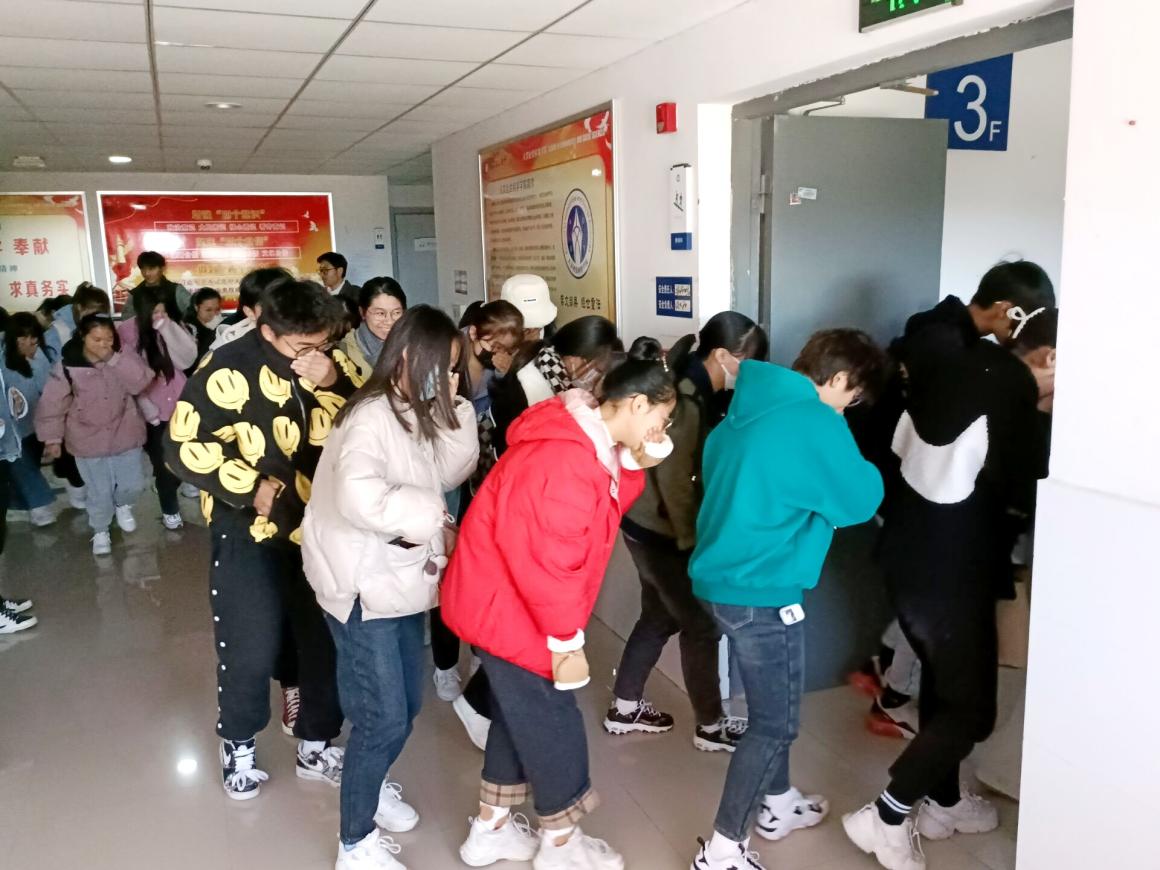 活动的第二部分是火灾险情疏散演练。警报声响起,消防疏散演练拉开帷幕。同学们按照先前所学习到的消防知识,低头,弯腰,用手或者衣物蒙住口鼻,在相关人员的疏散指导下,沿消防通道迅速有序离开,最终完成了人员的全部撤离。整个过程紧张有序,实用强,达到了预期效果。