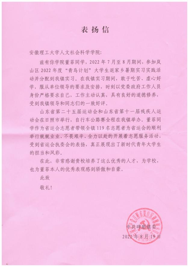 近日,人文学院收到了一封来自日照市山岚区碑廓镇委发来的表扬信,信中对我院政治学与行政学20-1班的董菲同学在山东省运会志愿者、山东省“青鸟计划”、文明创城期间的工作表现、积极奉献和获得的成绩表示肯定与感谢。